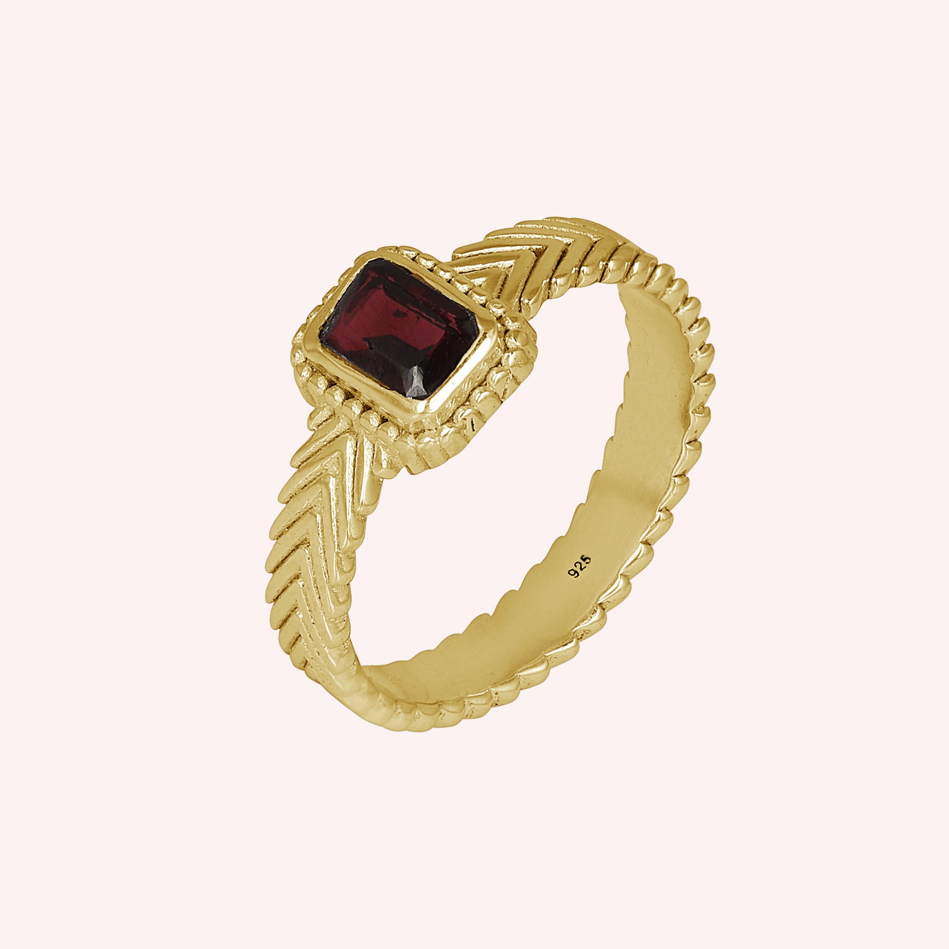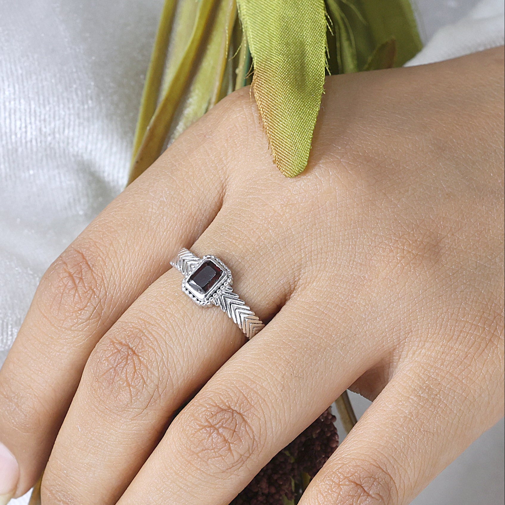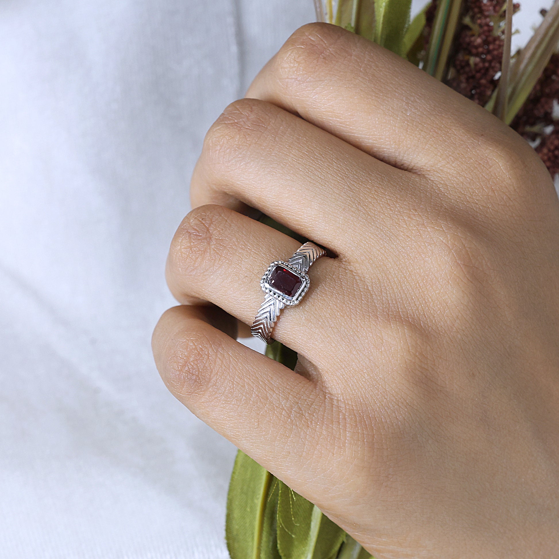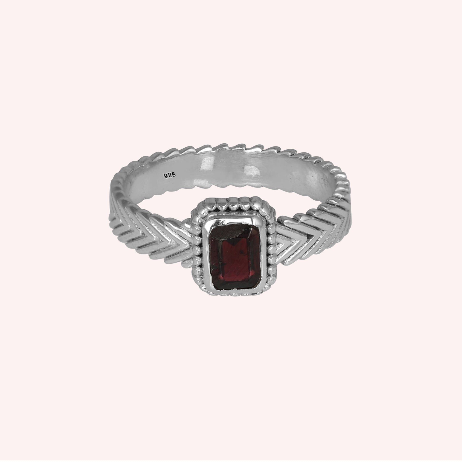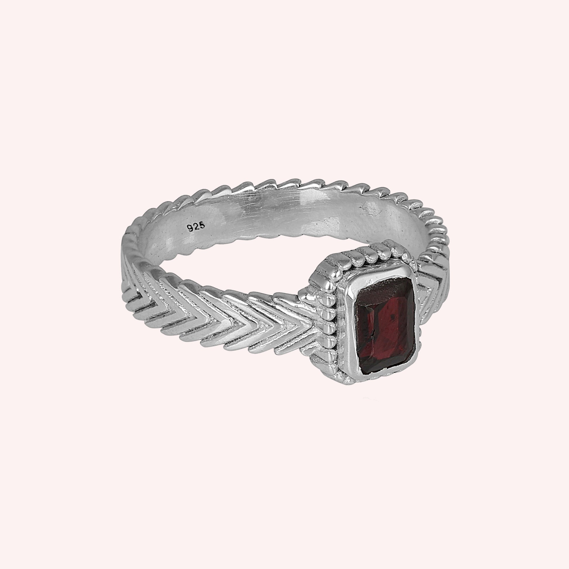 This exquisite silver ring highlights a captivating Baguette Garnet gemstone at its center, encased in an intricately beaded frame. The textured chevron-patterned band adds a distinctive sophistication to the design. Versatile and timeless, it’s perfect for both daily wear and special occasions.