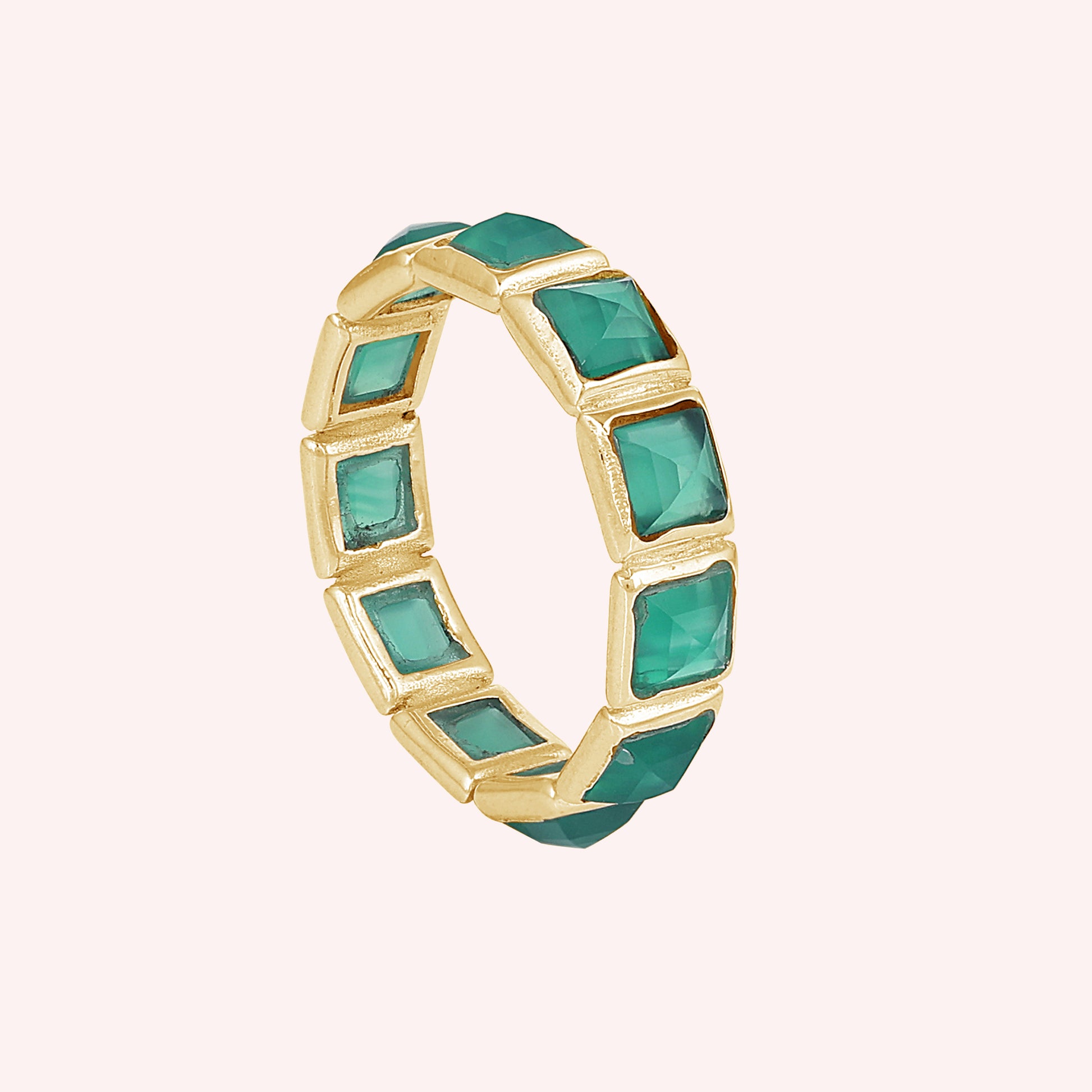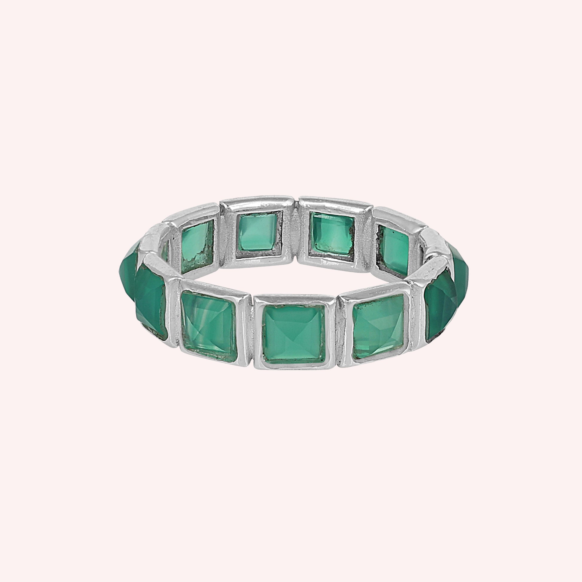 This full eternity band features square-cut Green Onyx gemstones set in sterling silver, offering a sleek, modern look. Known for promoting balance and positivity, this ring is perfect for stacking or wearing solo, making it a timeless jewelry piece.