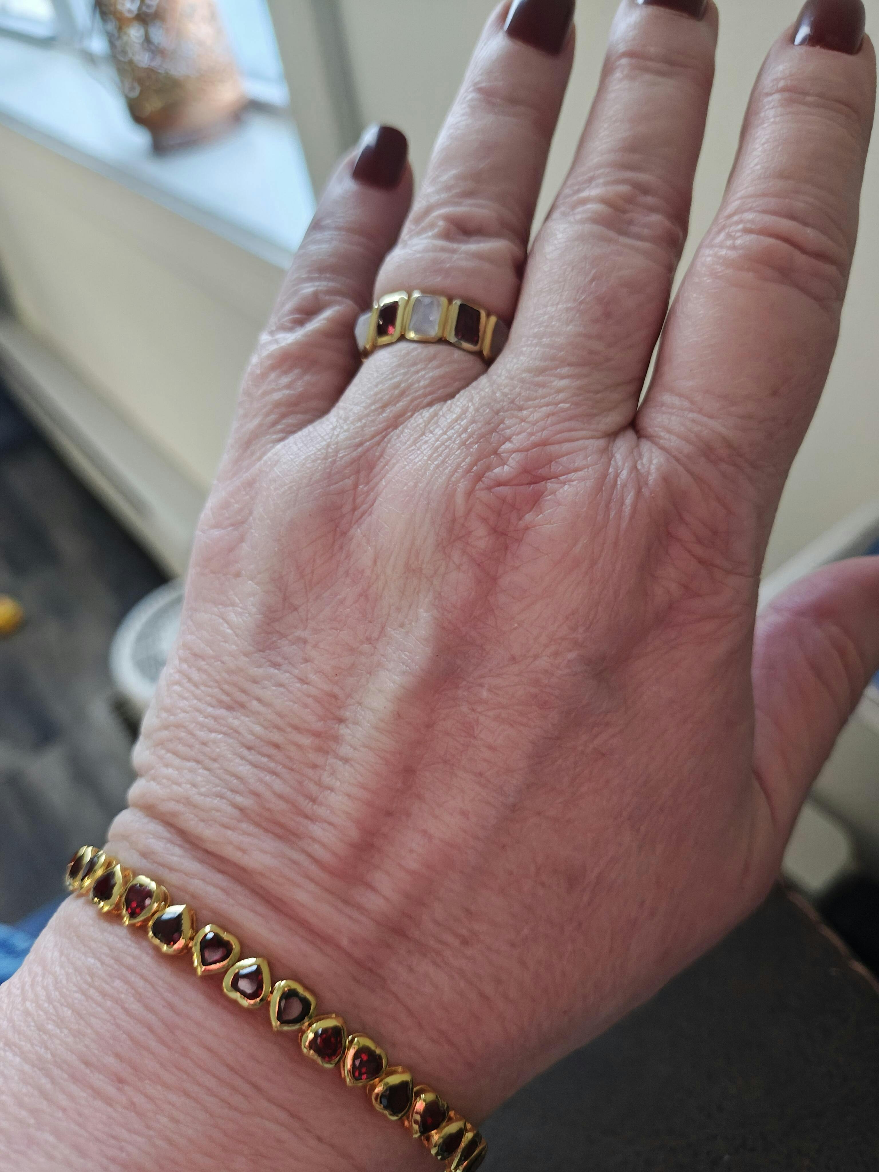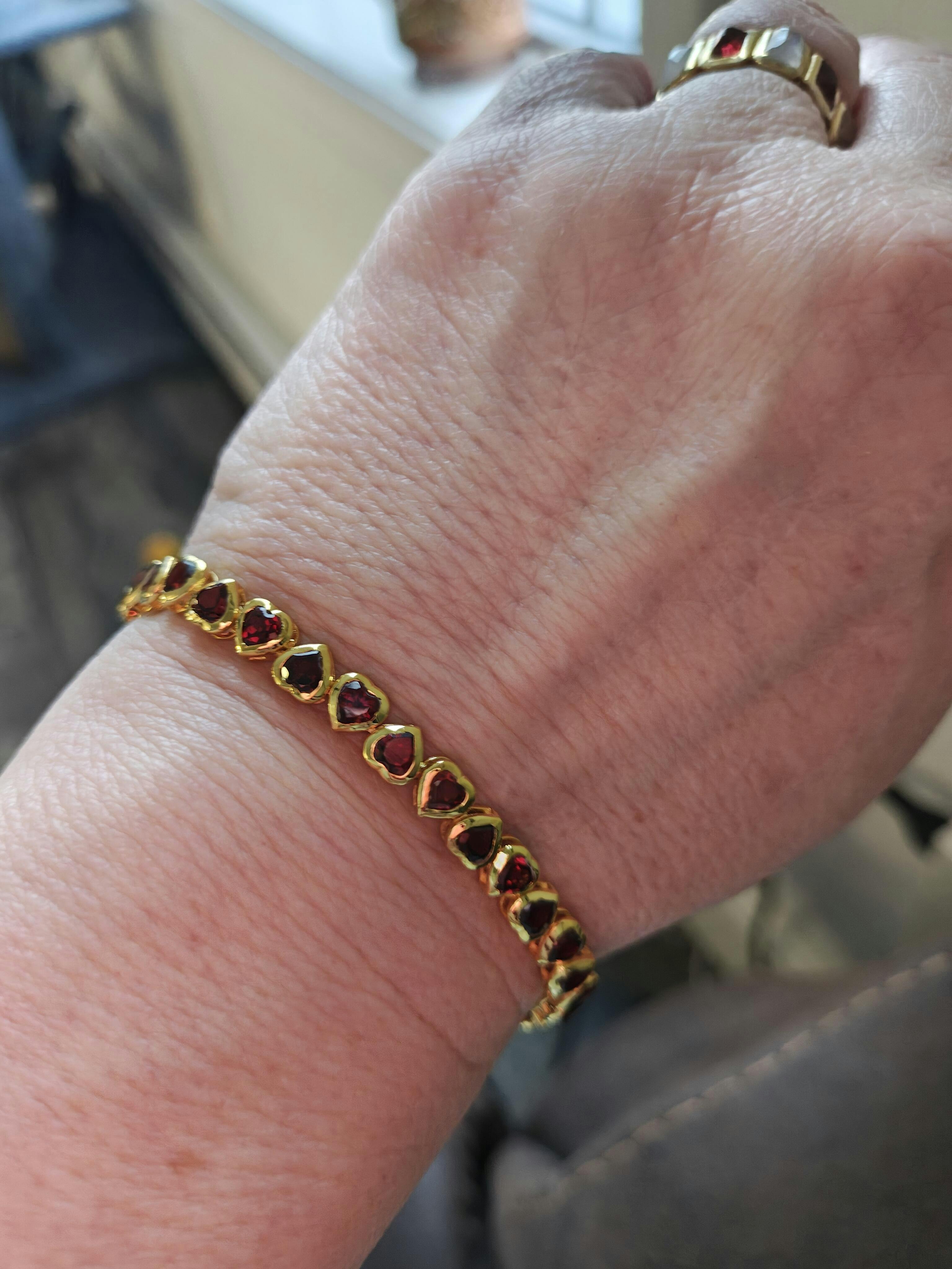 Sterling silver garnet bracelet with heart shaped red stones on a wrinkled white velvet background straight on view.