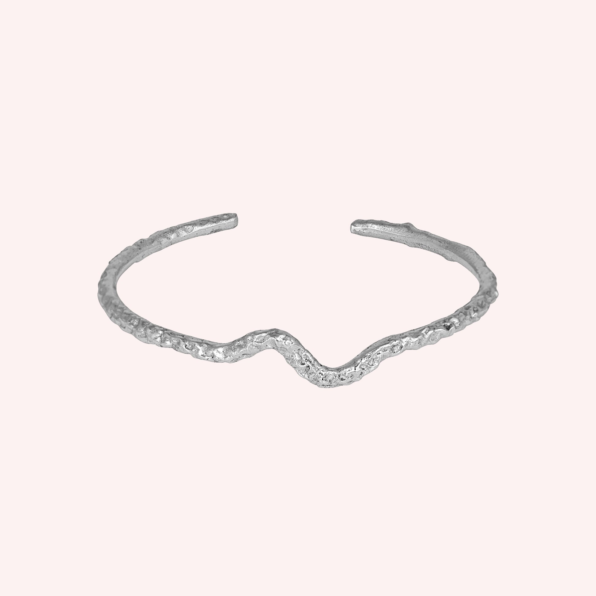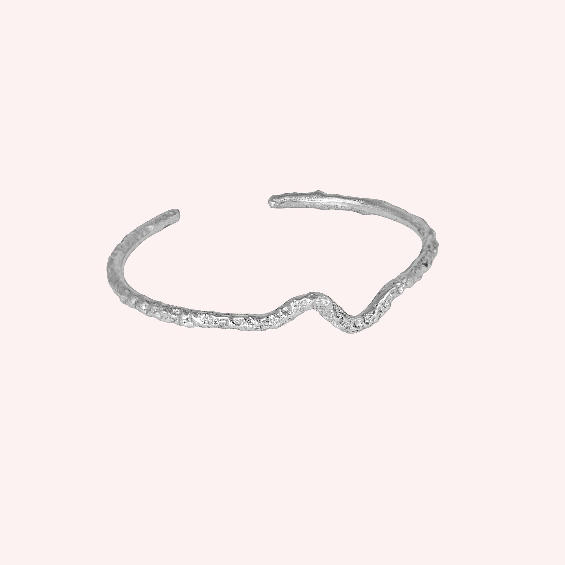 This handcrafted silver bangle showcases a unique wave-inspired design with a raw, textured finish. Elegant yet bold, it’s a versatile piece perfect for everyday wear or special occasions.