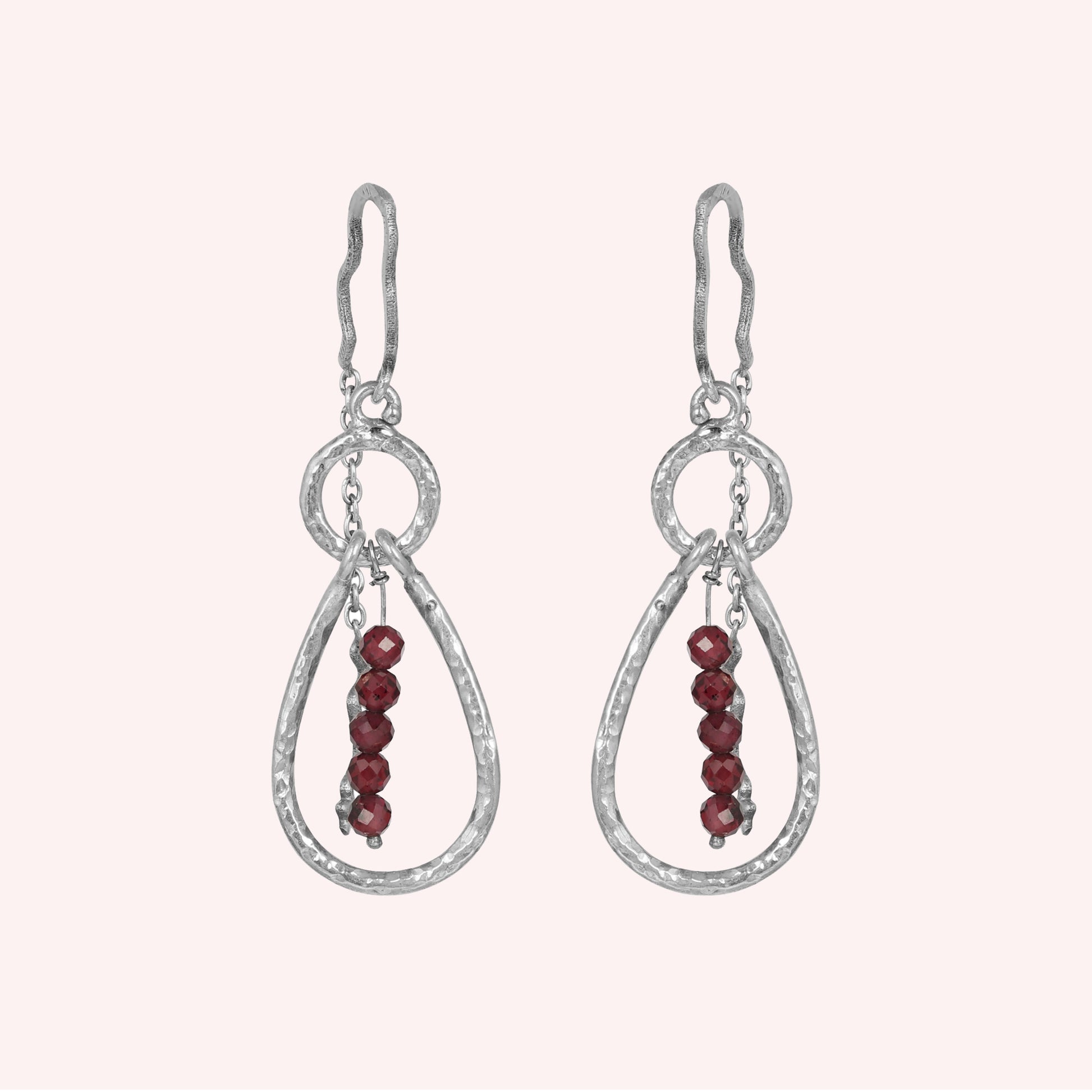 Crafted in sterling silver, these elegant drop earrings feature textured loops adorned with cascading deep red garnet beads. Accentuated by delicate chain details, they exude timeless sophistication.