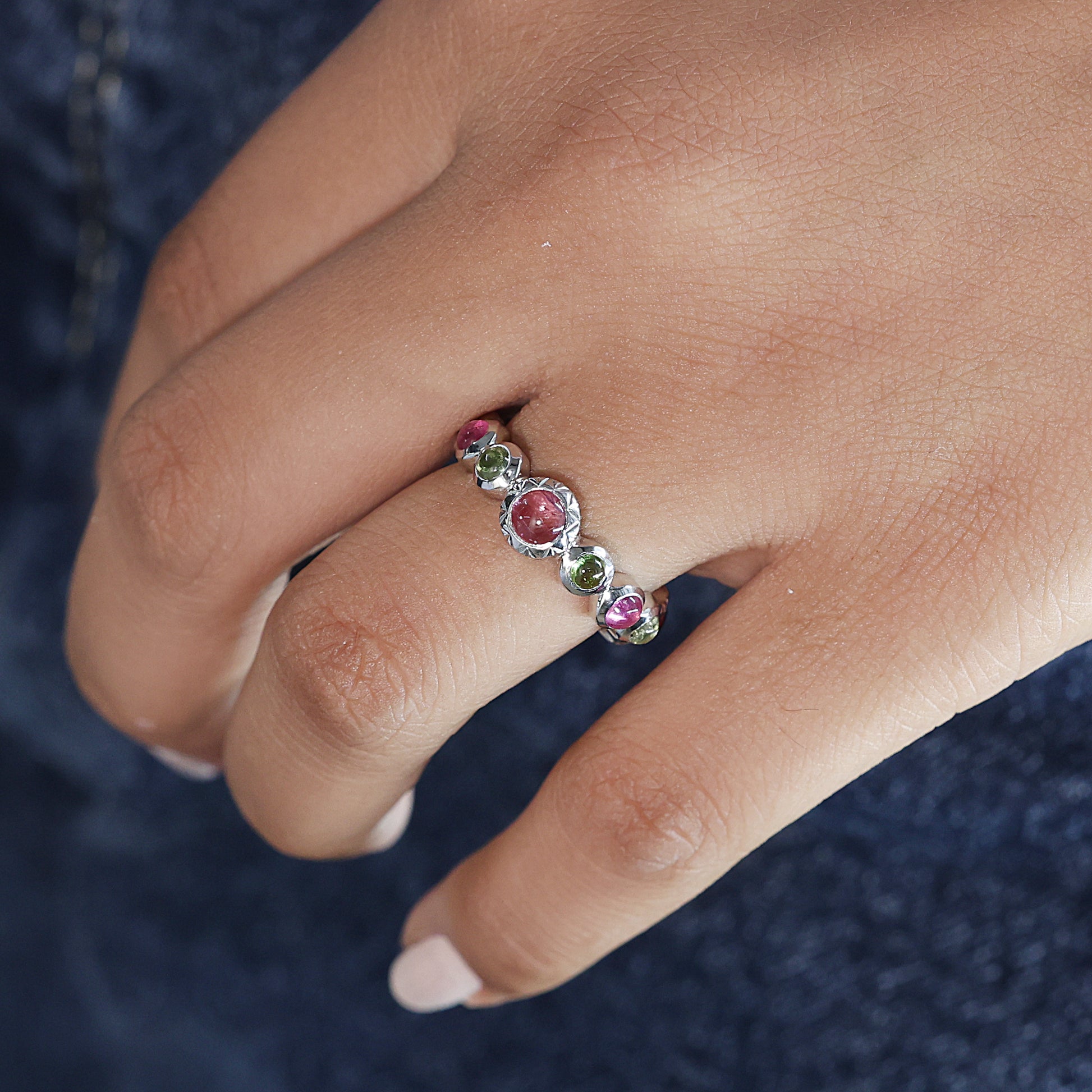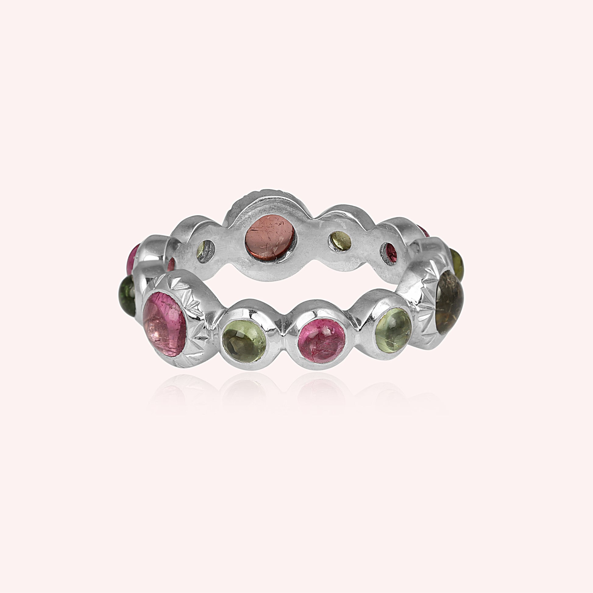 Elevate your style with this exquisite Green and Pink Tourmaline Ring, beautifully crafted in 925 sterling silver. The ring features a series of vibrant green and pink tourmaline stones, set in a detailed sterling silver full eternity band.