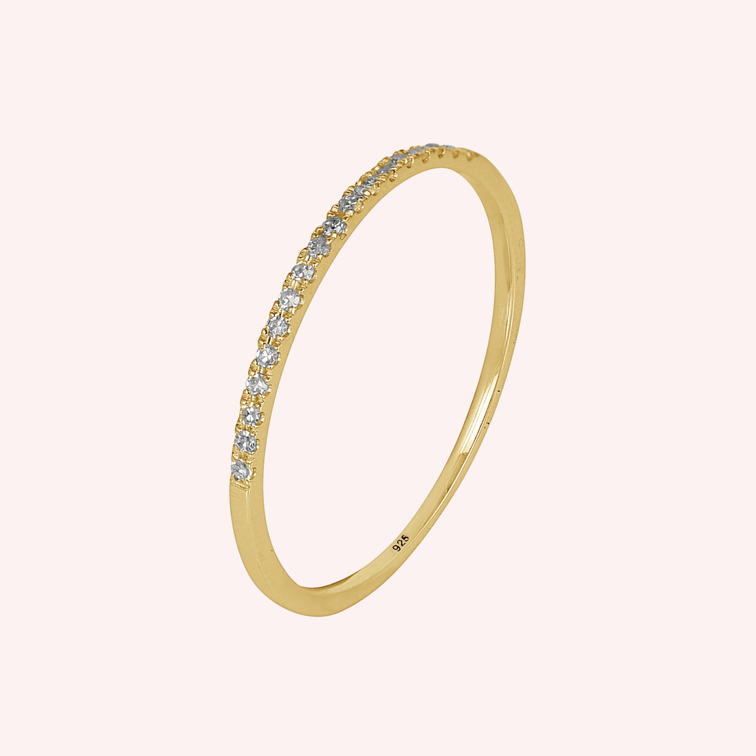 This sleek gold-plated ring features a delicate row of shimmering white topaz stones, offering timeless...