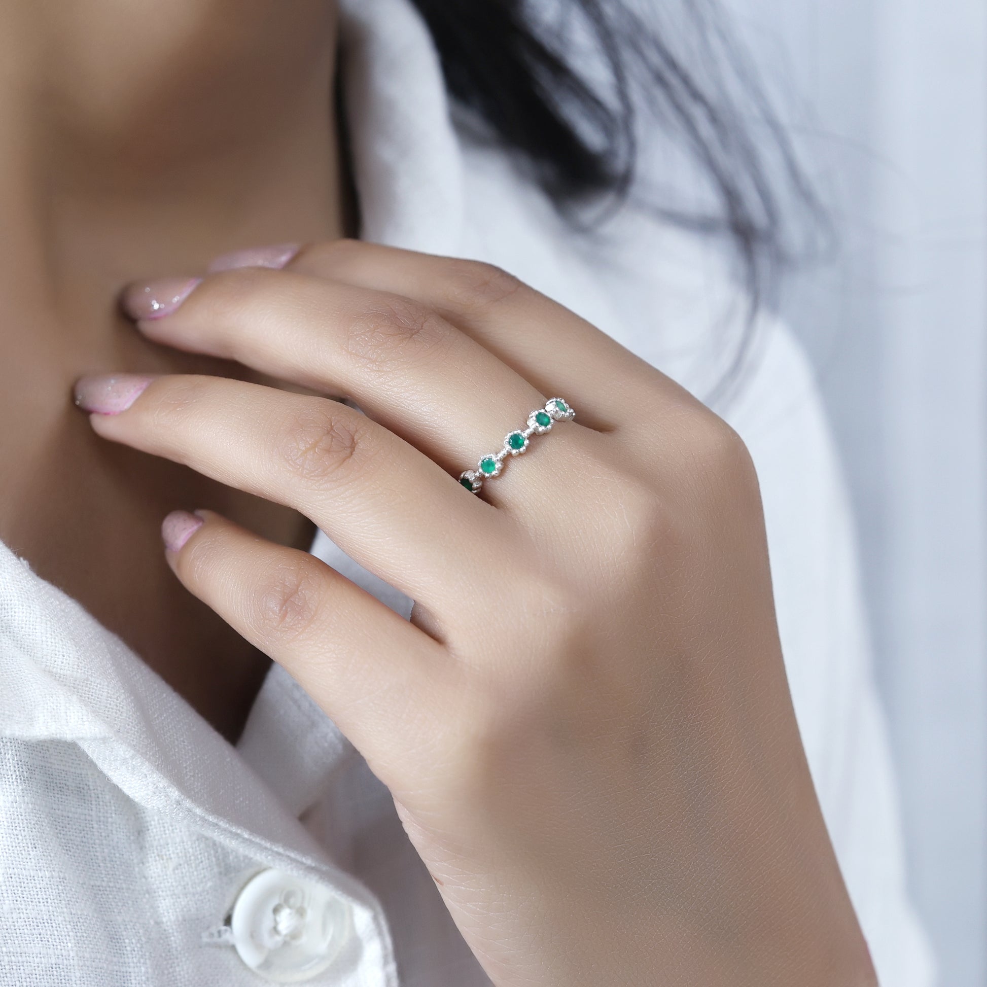 Nice stackable ring. The green onyx is pretty though not as bright as expected. Good quality overall.