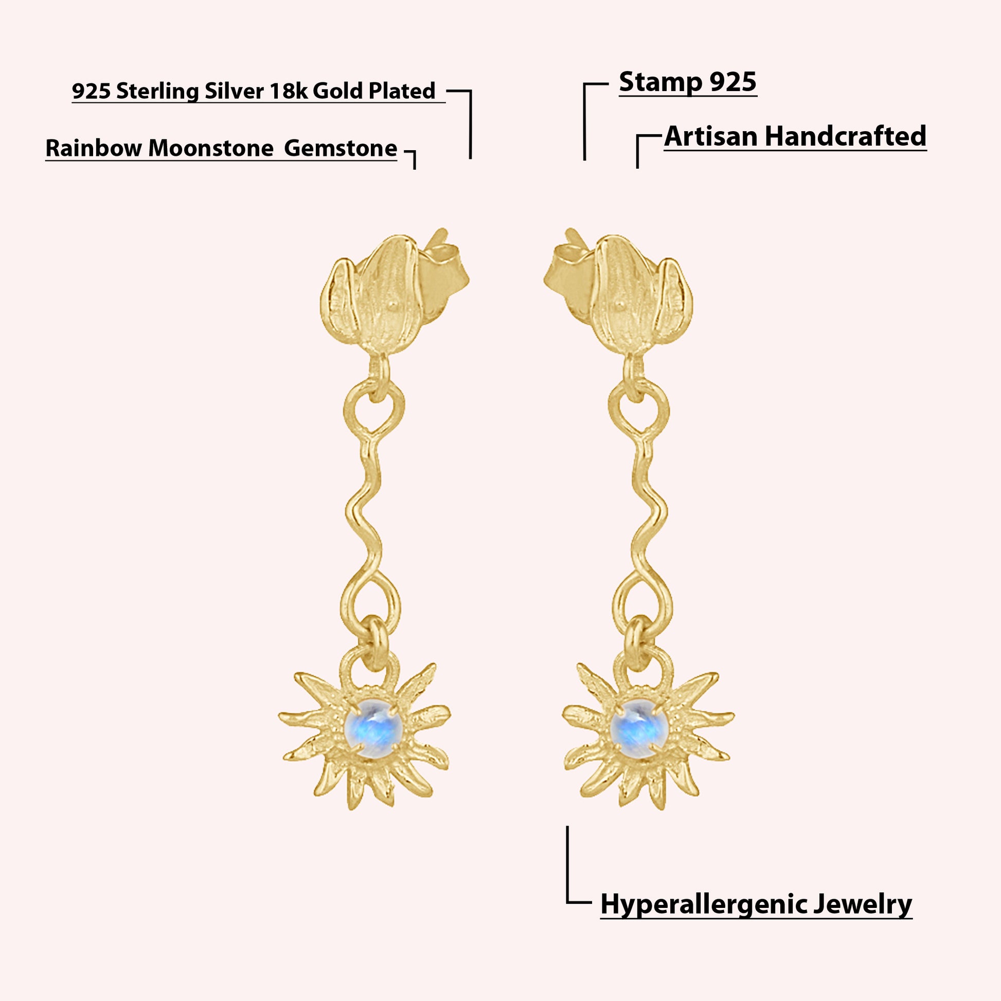 These exquisite sterling silver earrings feature a wavy drop design, ending in a radiant sunburst charm with a luminous moonstone center. Elegant and timeless, perfect for any occasion.
