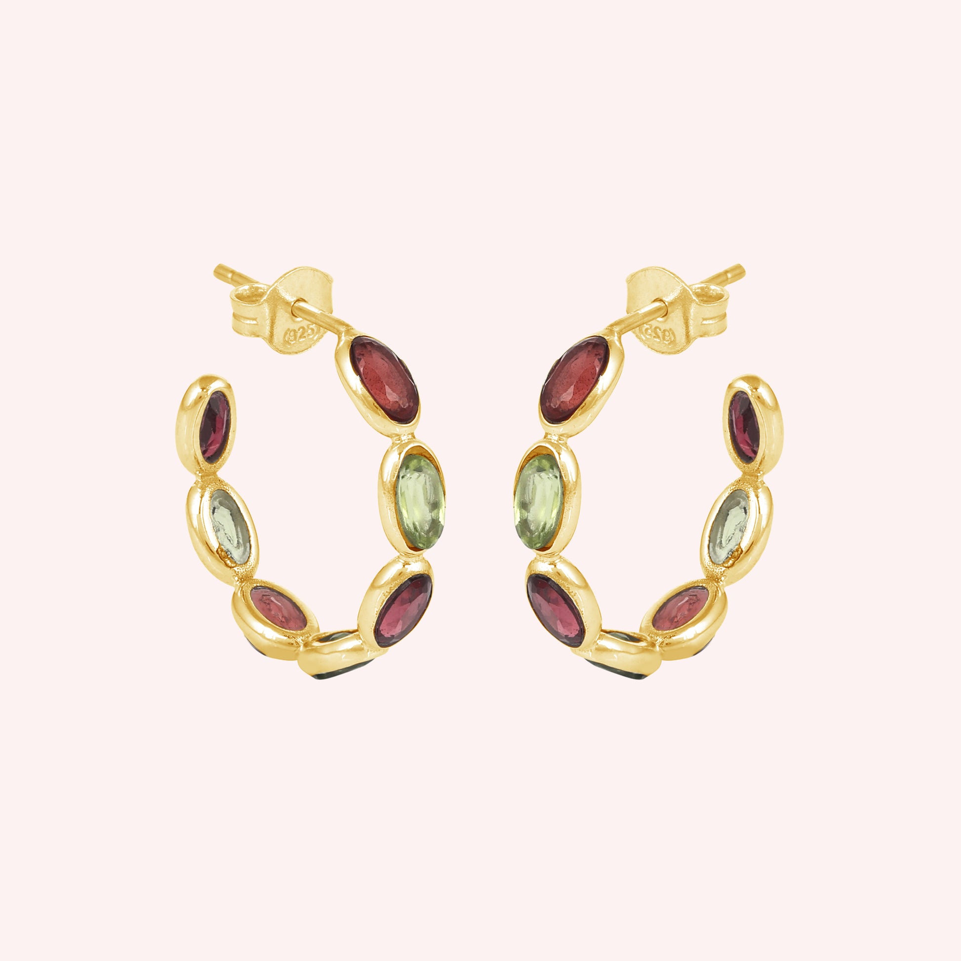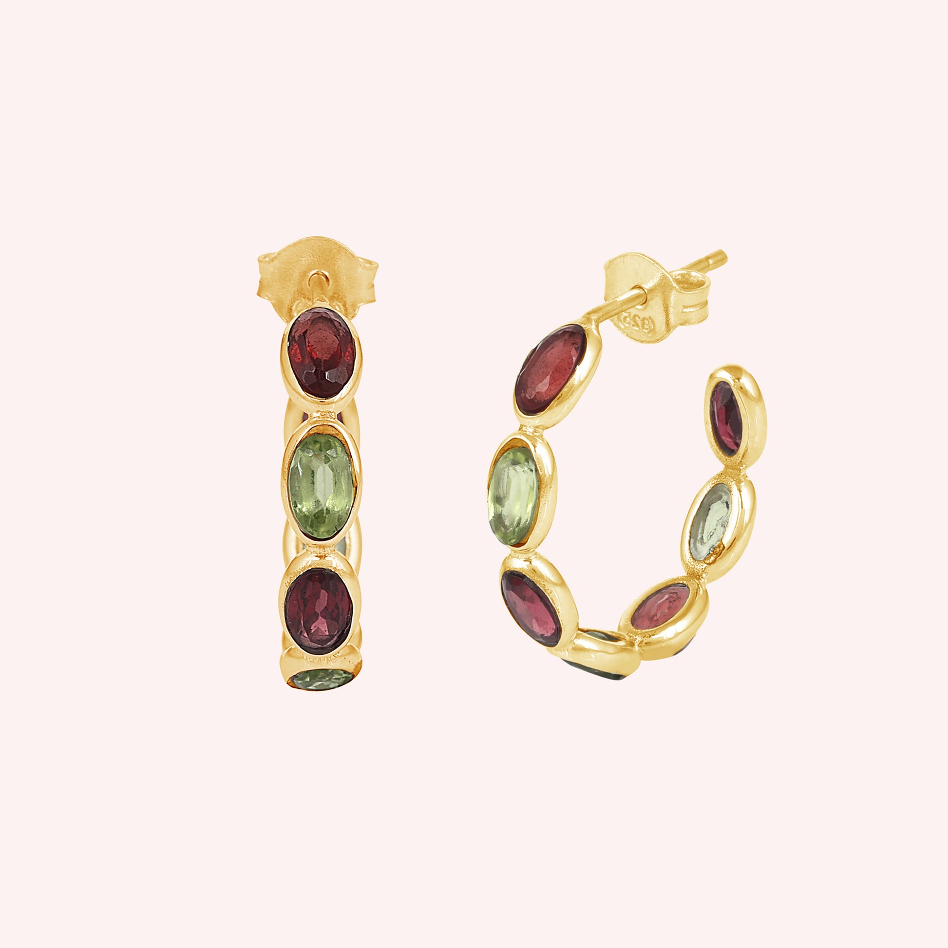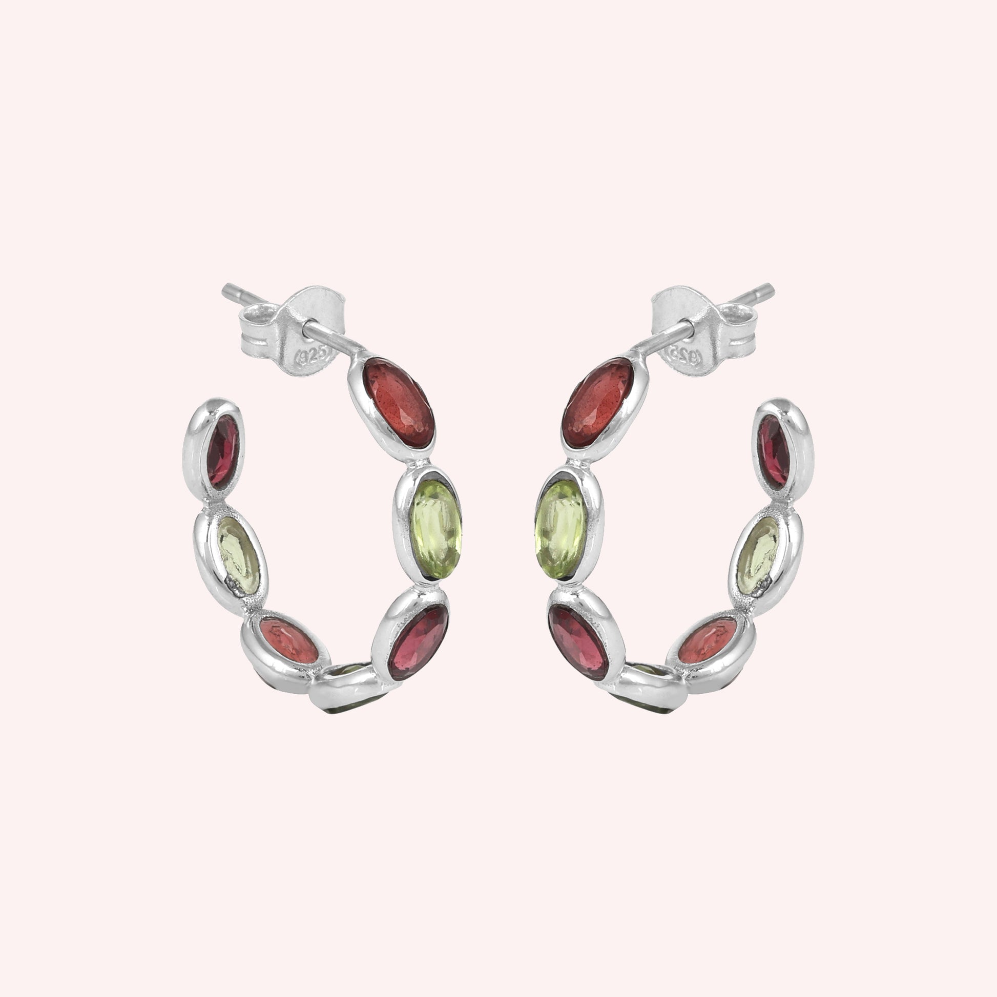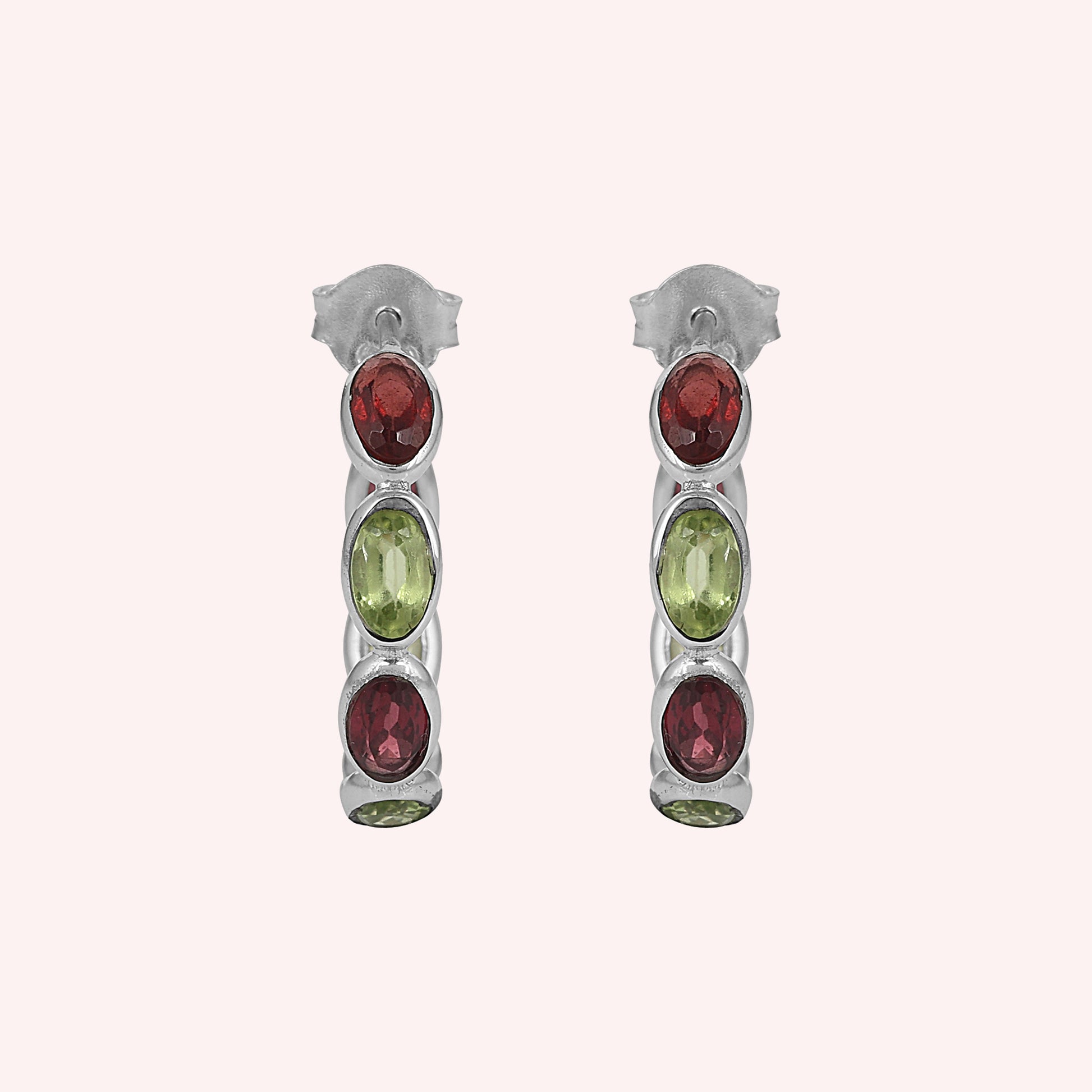 These stunning sterling silver hoop earrings feature alternating oval-cut garnet and peridot gemstones, creating a vibrant contrast of deep red and fresh green hues. Perfectly crafted for elegance and everyday wear, they add a touch of timeless charm to any outfit.