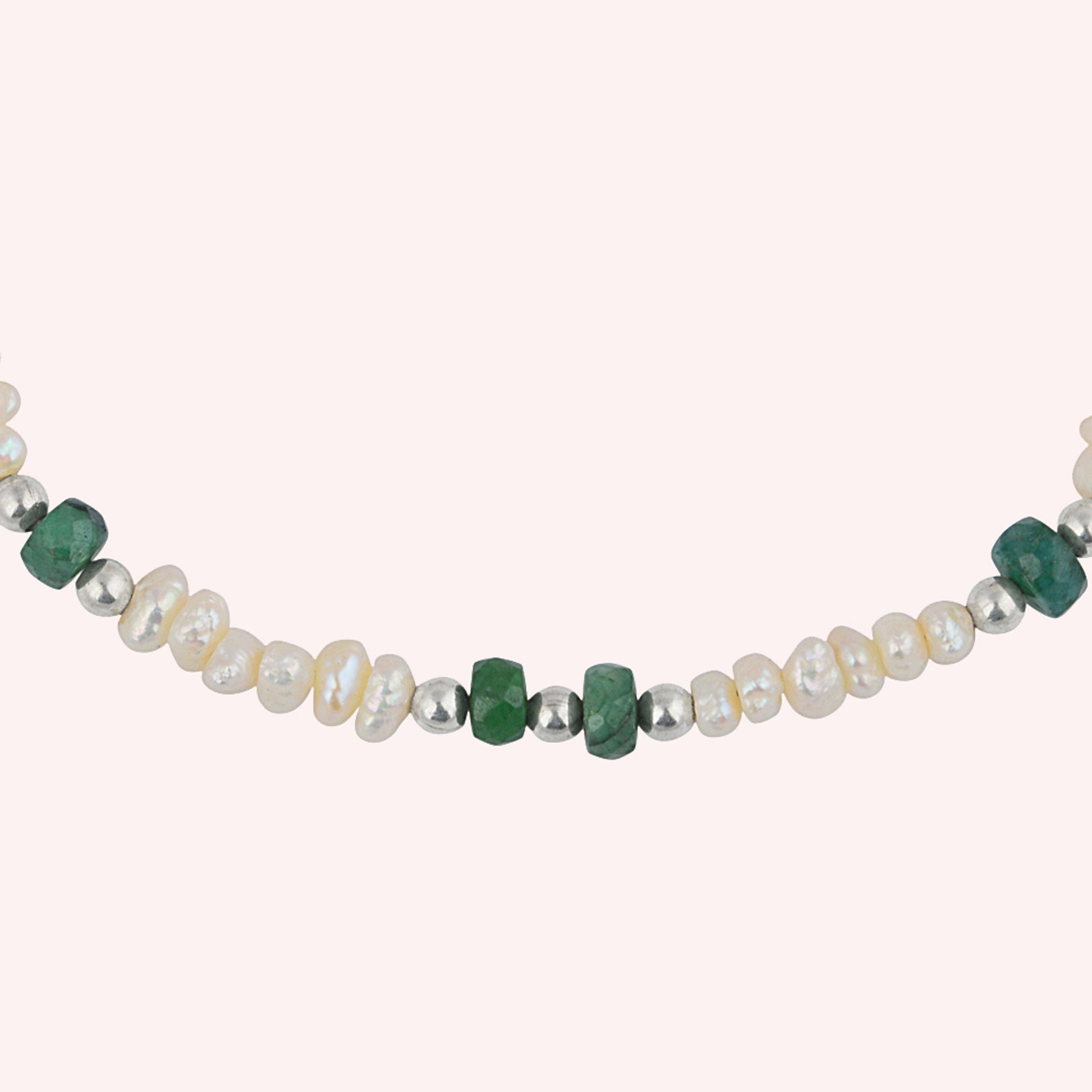 Beautiful bracelet! The contrast between white pearls and green emerald is stunning.