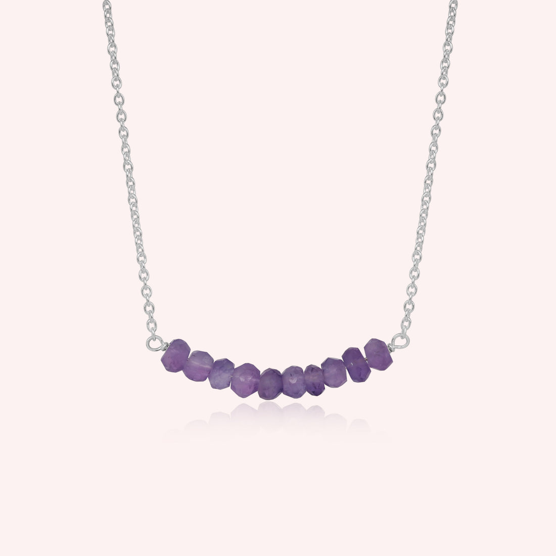 This elegant sterling silver necklace features natural amethyst beads, offering a minimalist touch of color....